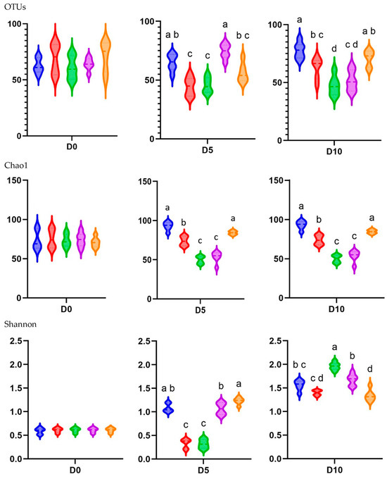 Alpha diversity represented by treatment group at the three different sampling times (D0, D5, and D10) as indicated by the OTUs observed and Chao1 and Shannon indices in the feces of weaned pigs fed a basal diet without ABO (T1, ■), with 120 ppm of colistin (T2, ■), or with 180, 240, or 360 ppm of halquinol (T3, ■; T4, ■; and T5, ■, respectively; n = 6). Letters inside the bars (a to d) indicate statistical significance (p < 0.05).