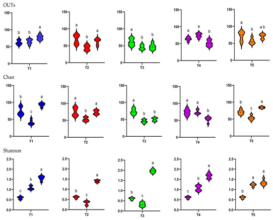 Alpha diversity in the feces of weaned pigs represented in terms of sampling time (D1, D5, and D10) per treatment group, as indicated by OTUs observed and Chao1 and Shannon indices. Pigs were fed a basal diet without ABO (T1, ■), with 120 ppm of colistin (T2, ■), or with 180, 240, or 360 ppm of halquinol (T3, ■; T4, ■; and T5, ■, respectively; n = 6). Letters inside the bars (a to c) indicate statistical significance (p < 0.05).