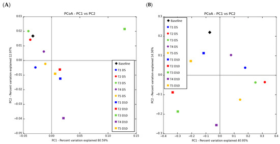 Each point in the PCoA represents the microbial ecology of a piglet; points closer together have more comparable microbial ecology. PCoA based on Bray–Curtis and weighted UniFrac distances revealed clear separation of the piglets’ fecal microbiota in the T3 and T4 diets at D10; however, the other microbiota mixed together from D1 to D10. Conversely, unweighted UniFrac distances revealed a significant alteration in the fecal microbiota composition of piglets from D1 to D10 across all diets.