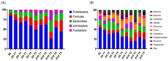 Across all the samples, Proteobacteria (59%), Firmicutes (17%), Bacteroidetes (15%), Actinobacteria (6%), and Fusobacteria (2%) were the most abundant phyla (Figure 7). At the genus level, there were nine taxa whose abundance exceeded 1% of the total sequences. Escherichia (33%), Acinetobacter (14%), Enterococcus (14%), Bacteroides (9%), and Klebsiella (7%) were the most predominant genera in the fecal microbiota. Phocaeicola (4%) and Parabacteroides (1%) were the two dominant genera in Bacteroidetes. Erysipelatoclostridium (2%) was the main genus in Firmicutes. The genus Fusobacterium, classified under Fusobacteria, constituted 2% of the total sequences.