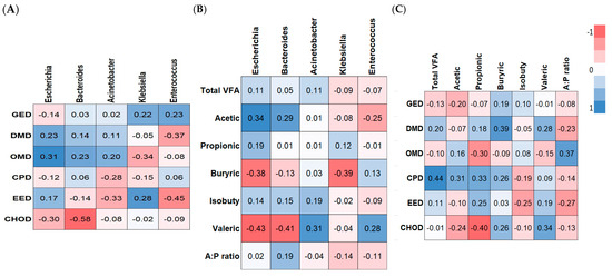 The possible relationships between the changes in the composition of fecal microbiota and ATTD (Figure 8A), VFAs (Figure 8B), and ATTD vs. VFAs (Figure 8C) were assessed using Pearson’s correlation analysis. The genus Bacteroides was negatively correlated with CHOD levels (R = −0.58, p < 0.01). The genus Enterococcus was negatively correlated with EED (R = −0.45, p < 0.05). The genera Acinetobacter, Klebsiella, and Enterococcus trended toward being negatively correlated with EED, OMD, and DMD, respectively (R = −0.30, p < 0.10). Only Escherichia trended toward being positively correlated with OMD (R = 0.31, p < 0.10).