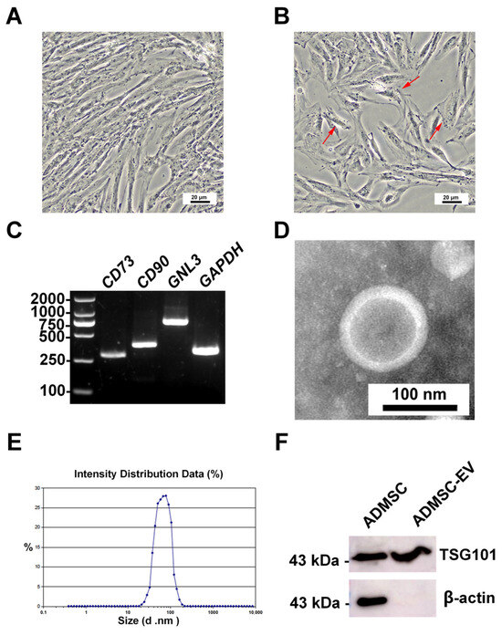 Morphology of the ADMSCs and characterization of EVs. (A) Passage 3 cells, cultured for 24 h; (B) Passage 8 cells, cultured for 24 h (red arrows indicate irregularly shaped ADMSCs); (C) RT-PCR analysis of CD73, CD90, and GNL3; (D) electron microscopy images of the ADMSC-EVs (2% uranium staining); (E) EV particle size distribution by Zetasizer; (F) WB results of the TSG101 and β-actin protein in giant panda ADMSCs and their EVs.