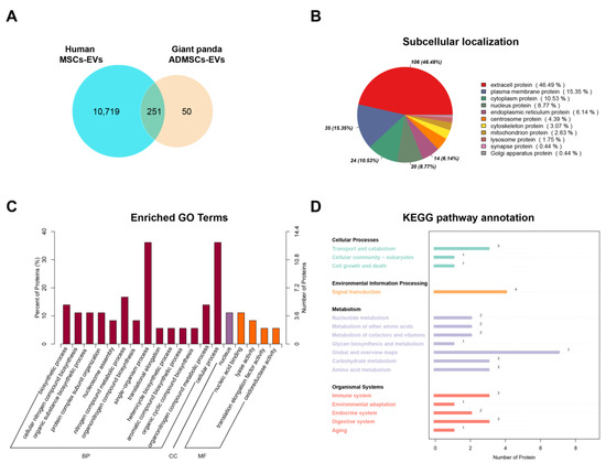 Comparative proteomic analyses of the human MSC-EVs and Qinling giant panda ADMSC-EVs. (A) Venn diagram of protein numbers in two species of EV; (B) subcellular localization of shared proteins; (C) GO analysis of the unique proteins in the giant panda ADMSC-EVs; (D) KEGG analysis of the unique proteins in the giant panda ADMSC-EVs.