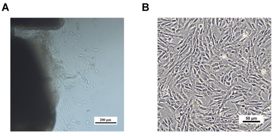 Dermal tissue was carefully dissected from the stillborn fetus, washed three times with PBS containing penicillin–streptomycin, and cut into 1 mm3 pieces, which were placed into a 60 mm culture dish. Next, 3 mL of DMEM containing 10% FBS was added, ensuring that the tissue remained submerged. Cell migration was monitored daily, and the medium was replaced every 48 h.