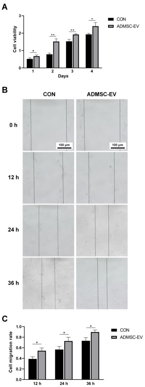 Proliferation and migration of skin fibroblasts treated with ADMSC-EVs. (A) Proliferation of skin fibroblasts following EV treatment (* p < 0.05, ** p < 0.01); (B) skin fibroblast migration following ADMSC-EV treatment; (C) cell migration rate statistics (* p < 0.05).