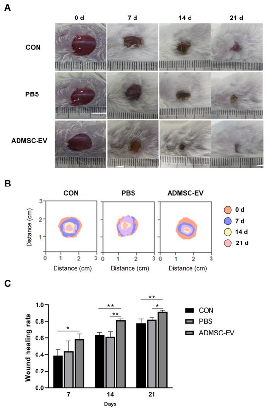 After 7 days of healing, all groups showed scab formation, with thin scabs, slight redness, and swelling surrounding the wounds (Figure 6A,B). The ADMSC-EV group exhibited a significantly higher wound healing rate compared to the CON group, although no statistical difference was observed between the ADMSC-EV and PBS groups (Figure 6C). After 14 days of healing, the wounds in the ADMSC-EV group showed a greater degree of epithelialization and a higher healing rate compared to both the CON and PBS groups (Figure 6A,C). Similarly, by day 21, the wounds in the ADMSC-EV group were almost completely healed, with significantly smaller wound sizes and higher healing rates compared to both the CON and PBS groups (Figure 6A–C).