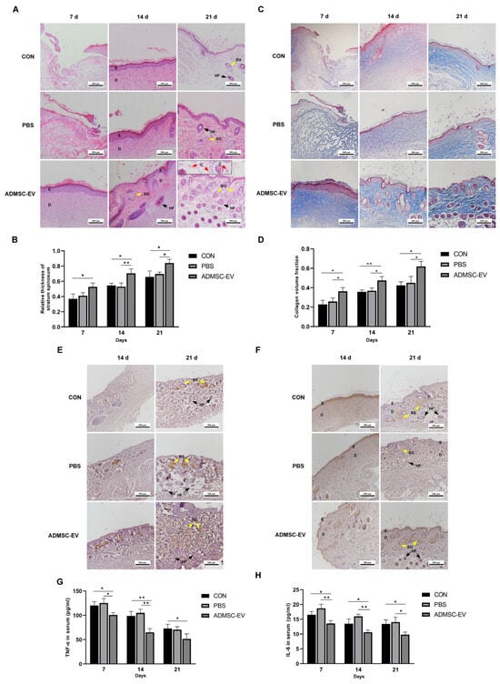 The H&E staining revealed that on day 7, the ADMSC-EV group exhibited a well-defined epidermal–dermal junction with densely arranged cells, indicating an enhanced early-stage tissue organization. At this stage, the relative thickness of the stratum spinosum in the ADMSC-EV group was higher compared to the CON group. By day 14, while the CON and PBS groups began to show a clear separation between the epidermis and dermis, only the ADMSC-EV group presented newly formed hair follicles and emerging sebaceous glands. On day 21, the ADMSC-EV group displayed a markedly higher number of visible hair follicles and sebaceous glands compared to the other groups, along with increased capillary formation within the dermis, suggesting that ADMSC-EV treatment significantly promotes skin appendage regeneration and angiogenesis (Figure 7A). Additionally, the relative thickness of the stratum spinosum in the ADMSC-EV group remained elevated compared to both the CON and PBS groups, further supporting the positive impact of ADMSC-EVs on epidermal regeneration (Figure 7B). The Masson’s trichrome staining results revealed that the collagen fibers gradually increased with skin healing. Compared to the CON and PBS groups, the collagen fibers in the ADMSC-EV group were thicker and more tightly arranged (Figure 7C). The collagen volume fraction in the EV group was higher than that in the CON and PBS groups at each stage (Figure 7D).
