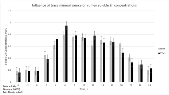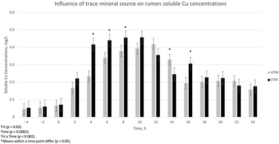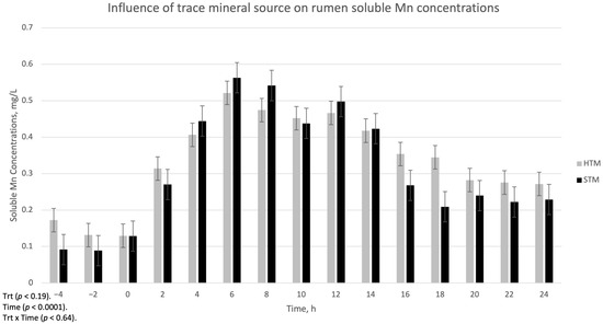 Copper, Mn, and Zn concentrations in the rumen digesta at 12 h post-dosing were lower in STM-dosed steers compared to HTM-dosed steers. This may indicate that more Cu, Mn, and Zn from STM-supplemented steers was released into the rumen environment. However, soluble Mn and Zn were similar across TM sources throughout all time points, and soluble Cu from STM was similar to HTM at 12 h post-dosing. We observed greater soluble Cu concentrations in the rumen of steers dosed with STM compared to steers dosed with HTM at 4, 6, 8, and 16 h post-dosing. These findings follow a similar trend to that reported in previous studies where reduced concentrations of soluble Cu were observed in the rumen of HTM- compared to STM-dosed steers consuming diets consisting of either grass hay [4], 50% corn silage 50% steam-flaked corn [6], or a diet formulated for lactating dairy cows [5]. However, ruminal-soluble Mn and Zn concentrations did not differ among the treatments in the current study. This is in contrast to findings from previous studies [4,5,6], where they observed higher levels of soluble Mn and Zn in STM-dosed steers compared to HTM-dosed steers. The reason for the variable responses between experiments may be due to the impact of diet type on rumen pH, as described previously.