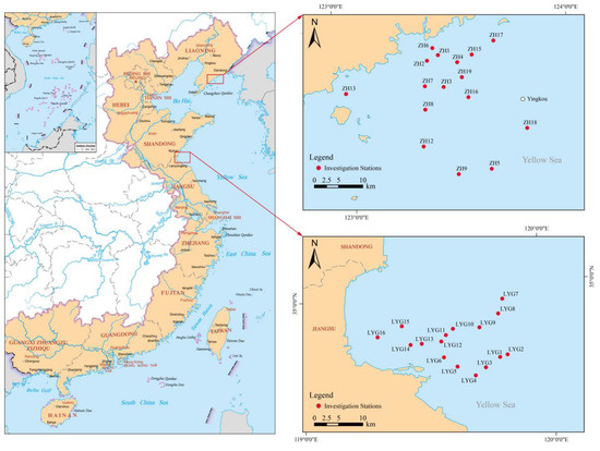 Distribution of sampling stations in the Yellow Sea. A total of 32 stations were investigated: 16 in the Zhuanghe (ZH) coastal area and 16 in the Lianyungang (LYG) coastal area.