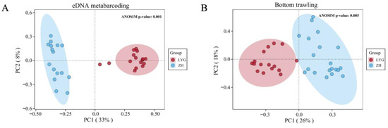 Based on the PCoA analysis of the sequence abundance of fish species shown in Figure 5A, when eDNA metabarcoding was used to detect the spatial distribution of fish in the Yellow Sea, PC1 explained 33% of the variation in the PCoA results based on Bray–Curtis distance, while PC2 explained 8%. The ZH and LYG coastal areas formed separate sets in the PCoA space, and the 16 stations in each area were relatively close to each other, showing a trend towards independent aggregation. In the PCoA analysis results using bottom trawling (Figure 5B), PC1 explained 26% of the variation, and PC2 explained 18%. Although the stations in ZH and LYG also showed a trend towards independent aggregation, the two areas formed an intersecting set in the PCoA space, and the distance between the stations was greater. The results showed that eDNA metabarcoding samples could be more clearly separated in the ZH and LYG areas than those obtained by bottom trawling.