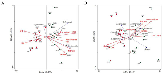 Relationships between fish community composition, based on eDNA metabarcoding (A) and bottom trawling (B) and the environmental factors. The red arrows represent environmental factors, while the blue arrows indicate representative fish species. Red circle markers are used for the stations in the ZH area, while dark green circle markers are used for the stations in the LYG area.