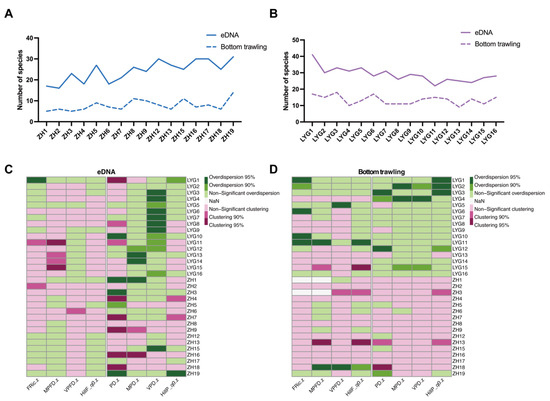 The Shannon, Simpson, and Chao1 indices for eDNA metabarcoding were all higher than those for the bottom trawling method, indicating that eDNA metabarcoding can obtain higher fish species diversity. Further analysis showed significant differences in the Shannon and Simpson diversity indices between the eDNA metabarcoding and bottom trawling methods in ZH (p < 0.05, Figure 4A,B). There were significant differences in the Pielou_J index between the eDNA metabarcoding and bottom trawling methods in LYG (p < 0.05, Figure 4D), and significant differences in the Chao1 index for both ZH and LYG (p < 0.05, Figure 4C).
