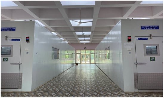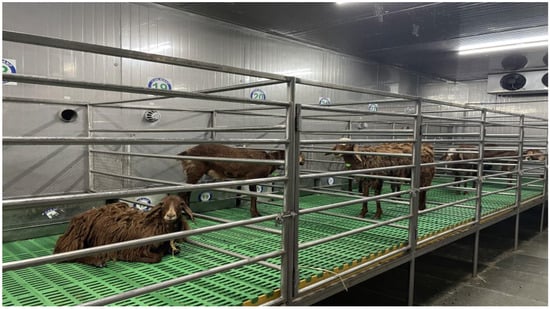 The climate chamber measures 12.8 m long, 3.41 m wide, and 2.87 m high, with a built area of 143.00 m2, and is made of laminated steel sheets with anti-corrosion protection and filled with polystyrene foam. Each chamber has a holding capacity of 12 animals with individual animal pen areas of 1.95 m2. Figure 1 describes the outside view of the climate chambers. The pens were partitioned with stainless steel rods to prevent the entry of sheep to adjacent pens. At the same time, this ensured that the animals were free of socialising stress since they could see other animals. The floor of each individual pen was 0.6 m above the floor of the climate chamber. Each pen had an individual feeder, waterer, and urine and faecal collection trays. The animals were maintained in individual pens throughout the study duration. Figure 2 describes the Kenguri sheep kept inside the climate chambers. Both the thermal comfort zone climate chamber and heating climate chamber are designed to provide the appropriate environmental conditions required for any environmental stress-related studies. It is an established fact that the thermal comfort zone for sheep ranges between 20 and 28 °C [38]. Therefore, the thermal comfort zone chamber was maintained at 24 °C throughout the study period for a six hour duration daily, between 10:00 h and 16:00 h, to provide the ideal thermal comfort zone to the KC and KCS groups’ ewes. In the heating climate chamber, the KHS and KHSS groups’ ewes were exposed to a simulated heat stress model, as described [39]. The simulated heat stress model was developed based on thirty years of ambient temperature and relative humidity data for the summer season (April, May, and June) in the study locality [39]. The model was developed with the intention of mimicking the natural environmental stress condition in the climate chamber. The time duration of six hours, between 10:00 h and 16:00 h, was chosen since only during this period were the animals exposed to heat stress while grazing in an extensive system of rearing. Moreover, from an animal ethical point of view, the simulated heat stress model was more practical and less stressful than constant heat stress models. The KC and KCS animals were exposed to 24 °C in the thermoneutral zone chamber to maintain thermal comfort, while the KHS and KHSS groups’ animals were exposed to heat stress in the heating chamber under a simulated heat stress model [39].