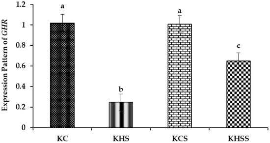 Among the different groups, significantly (p < 0.05) higher expression of GHR was recorded in the KC and KCS groups, followed by the KHS and KHSS groups. The expression of GHR was significantly reduced by heat stress (1.02 vs. 0.25; p < 0.001), but this significant reduction was increased by supplementation with herbs (0.25 vs. 0.65; p < 0.05). Further, there was a significant (p < 0.05) interaction between heat treatment and diet, such that the herbal supplementation increased the GHR expression during heat stress (0.25 vs. 0.65) but not under thermoneutral conditions (1.02 vs. 1.01).