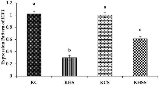 Effect of heat stress and herbal supplementation on the IGF1 mRNA expression pattern in Kenguri sheep. The expression patterns of IGF1 in the KC, KHS, KCS, and KHSS groups were 1.02 ± 0.04, 0.3 ± 0.04, 1.0 ± 0.04, and 0.61 ± 0.04, respectively. KC-Kenguri Control; KHS-Kenguri Heat Stress; KCS-Kenguri Control Supplement; KHSS- Kenguri Heat Stress Supplement. Different superscript letters (a, b and c) indicated extremely significant statistical differences among the treatment groups (p < 0.001).