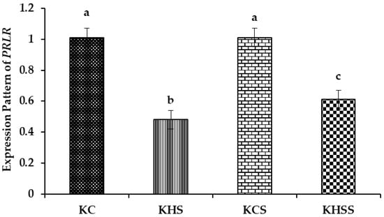 Among the different groups, significantly (p < 0.001) higher expression of PRLR was recorded in the KC and KCS groups, and the lowest was recorded in the KHS and KHSS groups. The expression of PRLR was significantly (p < 0.001) reduced by heat stress (1.01 vs. 0.48), but the reduced expression of PRLR was not altered by herbal supplementation (0.48 vs. 0.61). Further, the temperature x diet interaction did not significantly influence the expression pattern of PRLR.