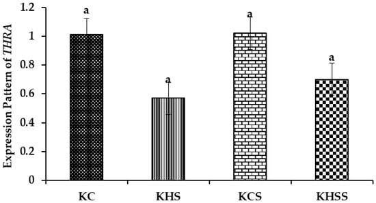 Effect of heat stress and herbal supplementation on the THRA mRNA expression pattern in Kenguri sheep. The expression patterns of THRA in the KC, KHS, KCS, and KHSS groups were 1.01 ± 0.10, 0.57 ± 0.10, 1.02 ± 0.10, and 0.70 ± 0.10, respectively. KC-Kenguri Control; KHS-Kenguri Heat Stress; KCS-Kenguri Control Supplement; KHSS- Kenguri Heat Stress Supplement. Different superscript letters (a, b and c) indicated extremely significant statistical differences among the treatment groups (p < 0.001).
