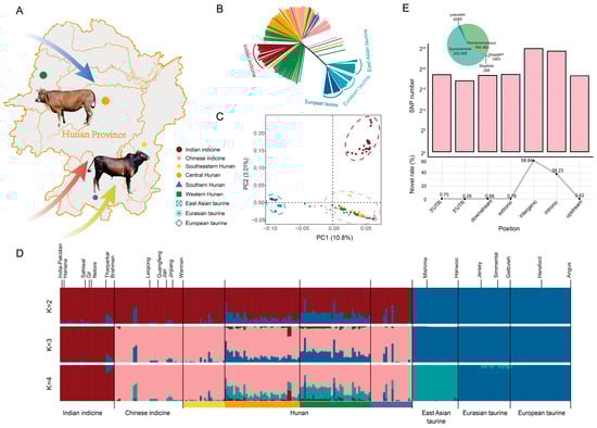 There were 110 cattle collected from southeastern Hunan (n = 20), central Hunan (n = 36), western Hunan (n = 34) and southern Huan (n = 20) in the Hunan province, China. Among the 110 cattle, 17 samples were new in this study. We collected their ear tissue samples and use a standard phenol/chloroform-based protocol to extract the genomic DNA. We used Illumina NovaSeq 6000 at Novogene Bioinformatics Institute, Beijing, China, to sequence data with paired-end libraries and had an average read length of 150 bp [8]. Other Hunan cattle were collected from different projects (Table S1). To more clearly show the ancestral components of these Hunan cattle, we chose 135 samples from other studies in different and testified groups. They were Chinese indicine (n = 33), Indian indicine (n = 26), East Asian taurine (n = 22), Eurasian taurine (n = 25), and European taurine (n = 29) (Table S1). Finally, a total of 245 samples were used in this study.