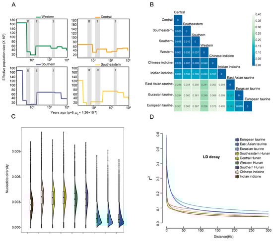 Past demographic reconstruction using SMC++ [29] indicated the changes in effective population size (Ne) in four Hunan regions. Western and southern Hunan have a similar effective population size pattern, which was relatively stable in the Second Pleistocene glacial period, gradually declined in the last glacial medium, and increased in the Early Holocene optimum. Central Hunan only had a gradual decline in the last glacial medium while southeastern Hunan had a decline in the Early Holocene optimum (Figure 2A) [1,8]. Genetic distance measurements among these group were assessed using an FST matrix, revealing variability ranging from 0.007 to 0.405. There is a close distance within Hunan cattle, whilst Hunan cattle show subtle differences with Chinese indicine and more differences with Indian indicine, and show notably higher genetic differentiation from Bos taurus (Figure 2B). The nucleotide diversity analysis of these cattle breeds revealed that Bos indicus has a higher average nucleotide diversity, especially in Chinese indicine (3.61 × 10−3) and Hunan cattle, respectively, in the southern Hunan (3.36 × 10−3), the western Hunan (3.36 × 10−3), the southeastern Hunan (3.50 × 10−3) and the central Hunan (3.56 × 10−3), whilst Indian indicine (2.71 × 10−3) are lower than them but are higher than taurine. Among all taurine, European cattle is the lowest one (1.19 × 10−3), while Eurasian taurine (1.22 × 10−3) and East Asian taurine (1.23 × 10−3) are higher (Figure 2C). The LD plot showed Bos indicus has a faster decay compared with Bos taurus when the physical distance of SNP is less than 10 KB. The samples in central and western regions have a faster decay than the purer samples in the southern and southeastern regions of Hunan (Figure 2D).