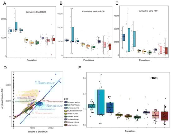 The analysis of ROH length and correlation. (A–C) The cumulative length of short, medium, and long ROH based on the module of the unsupervised three-component Gaussian. (D) Correlation between the cumulative lengths of short ROH and medium ROH. The orange region is Hunan cattle. (E) FROH in different groups. The color represents different groups.