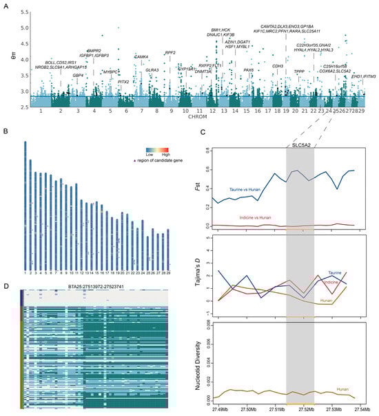 Positive signatures in Hunan cattle. (A) Manhattan plot of selective sweeps by θπ. The marked genes were candidate genes. (B) The mixture of the regions with |iHS| > 2. Low intensity is represented in blue and high intensity in red. The purple markers indicate the locations of the candidate genes, which were the same as the θπ method. (C) FST, Tajima’s D, and nucleotide diversity plot of the SLC5A2 gene. The gray-shaded boxes represent the region of SLC5A2. (D) Haplotype patterns were plotted by heatmap. The dark blue represents taurine, dark red represents indicine, and brown represents Hunan cattle.