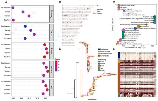 Genome-wide introgression from wild Bos species into Hunan domestic cattle. (A) Alle sharing of f4 pop (Indian indicine, Hunan cattle, wild, buffalo) between Hunan cattle and wild species. The circle represents |Z-score|. (B) Map of introgressive segments from banteng and gaur in Hunan cattle, the blue lines represent the segments from banteng, yellow lines represent gaur, and red lines represent the overlap segments from these two species. (C) The KEGG and GO pathways from the genes on the overlap segments from banteng and gaur into Hunan cattle. (D) Phylogenetic trees were constructed using the haplotype sequences of BTA6: 70.14 Mb–70.22 Mb region. (E) Haplotype patterns were built by SNPs in the region of BTA6: 70.14 Mb–70.22 Mb region. Color of the blank represents different populations.