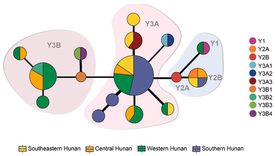 Y-chromosome phylogenies. The circular area is proportional to the sample size. MJ network of Y-chromosome haplotypes in four regions of Hunan male cattle. The blue shadow covers the haplotype in taurine cattle, while the pink shadow represents indicine haplotype. Different levels of pink were used to differentiate Y3A and Y3B.