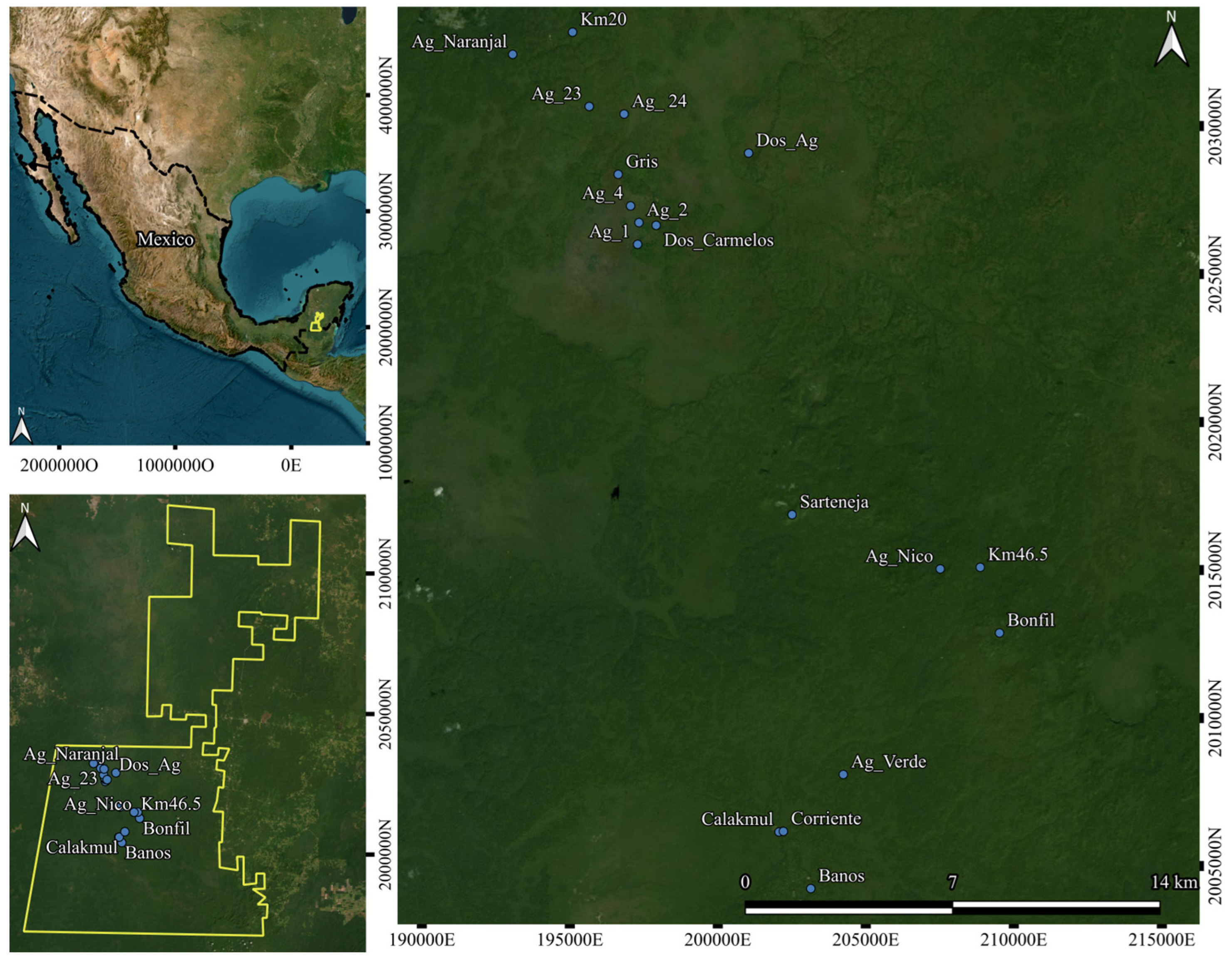 - Martínez, E.; Leal, C.G. La vegetación de Calakmul, Campeche, México: Clasificación, descripción y distribución. Bot. Sci. 2002, 71, 7–32. [Google Scholar] [CrossRef]