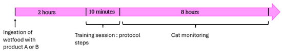 Gabapentin or the placebo was administered orally 2 h before each training session, mixed with wet food. Owners were instructed to offer the food spontaneously and not force administration. If the cat refused to eat, this was recorded before the session. Even if the cat completely refused to eat, the session was conducted without the treatment, but data were still collected. A summary of a single training session is presented in Figure 2.