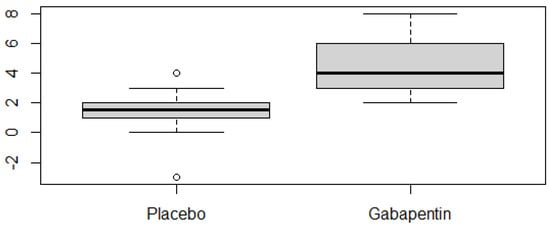 A comparison of the two conditions (placebo vs. gabapentin) among the 22 cats that ingested both products clearly showed significantly faster learning progress with gabapentin (Wilcoxon’s test, W = 43.5, p = 2.37 × 10−6), as shown in Figure 3. The effect size (d = 0.869) confirmed a strong effect of the drug on learning speed.