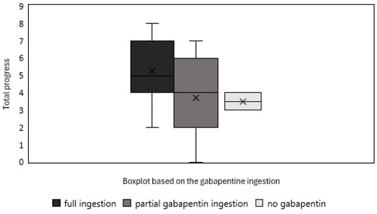 The boxplot shown in Figure 4 illustrates the total progress of cats by the end of the 10-session training, categorized based on their gabapentin ingestion. Cats that fully consumed both products (n = 22) showed the highest median progress, while those that only partially ingested gabapentin (n = 11) had a slightly lower median but a wider variability. The two cats that refused gabapentin entirely (n = 2) demonstrated the least progress; however, given the very small sample size, this result should be interpreted with caution. Despite having only five medicated sessions for those that ingested gabapentin, the trend suggests that higher gabapentin intake is associated with greater overall progress, reinforcing its potential role in facilitating learning.