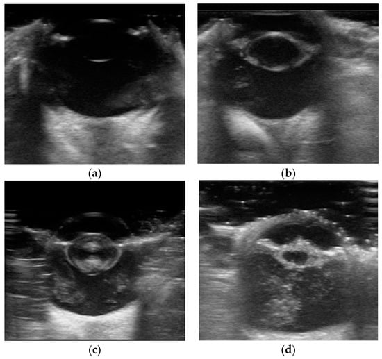 Representative samples from the collected eye B-ultrasound image dataset, showing (a) an eye without cataract, (b) an eye with cortical cataract, (c) an eye with mature cataract, and (d) an eye with hypermature cataract.