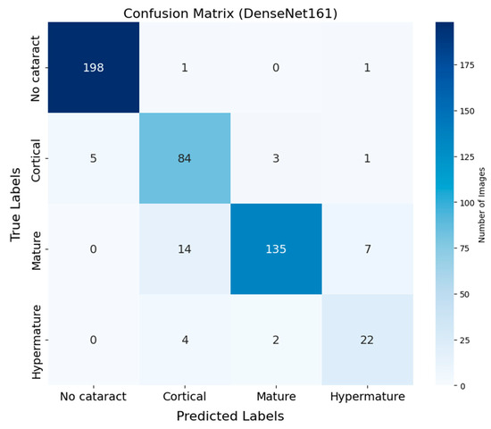 The confusion matrix of DenseNet-161 demonstrates the classification performance across four cataract stages (Figure 2). Correct classifications appear along the diagonal, while off-diagonal values represent misclassifications. The No cataract category exhibited the highest classification accuracy, with 198 correctly classified instances out of 200 (99.0%), highlighting the model’s robustness in identifying eyes without cataracts. The Cortical category followed with 84 correct classifications out of 93 instances (90.3%), while the Mature category achieved 135 correct predictions out of 156 samples (86.5%). The Hypermature category showed relatively lower accuracy, with 22 correct predictions out of 28 samples (78.6%). Additionally, the sensitivity and specificity for each cataract stage were as follows: for No cataract, the sensitivity was 99.0% and the specificity was 99.4%; for Cortical cataracts, the sensitivity was 90.3% and the specificity was 97.4%; for Mature cataracts, the sensitivity was 86.5% and the specificity was 95.6%; and for Hypermature cataracts, the sensitivity was 78.6% and the specificity was 98.1%. The most common source of classification errors occurred between the Cortical and Mature stages, with 14 instances of Mature cataracts misclassified as Cortical and three instances of Cortical cataracts misclassified as Mature.