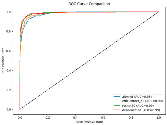 ROC curve comparison of four CNN models (AlexNet, EfficientNet-B3, ResNet-50, and DenseNet-161) on ultrasound images. The area under the curve (AUC) values indicated that ResNet-50 and DenseNet-161 achieved the highest AUCs (0.99), followed by EfficientNet-B3 and AlexNet (0.98).
