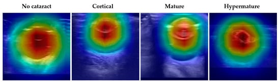 To evaluate the interpretability of DenseNet-161, the best-performing model in diagnosing cataracts using ocular ultrasound images, Grad-CAM was employed to visualize the model’s focus during inference. The final convolutional layer was used for feature map generation. These visualizations reveal that the model predominantly attended to the lens region, as indicated by the red areas with high attention weights, while areas corresponding to irrelevant background appeared blue (Figure 4). This consistent focus on the lens across all categories underscores the model’s capacity to prioritize key anatomical features critical for accurate cataract diagnosis.