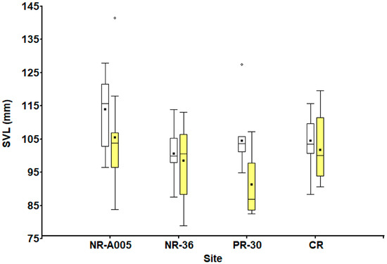 According to the Shapiro–Wilk test (p > 0.05), size values for both sexes were normally distributed, and Levene’s test confirmed homogeneity of variance (p > 0.05). There was a significant difference in the SVL of females among sites (F3,80 = 2.88, p < 0.05). Post hoc analyses revealed statistically significant differences between sites, particularly between NR-A005 and NR-36 with each other and with the other sites (Bonferroni test, p < 0.05); females at NR-A005 were significantly bigger, while at NR-36, they were significantly smaller (Figure 1). Whereas the SVL of males was statistically different among sites (F3,38 = 2.78, p = 0.05). In both cases, a higher SVL is observed in individuals from the NR-A005site, with an intermediate SVL at CR and lower SVLs at NR-36 and PR-30 (Figure 1). The SVL at sexual maturity was slightly higher in females than in males at all sites, except at CR (Table 1).