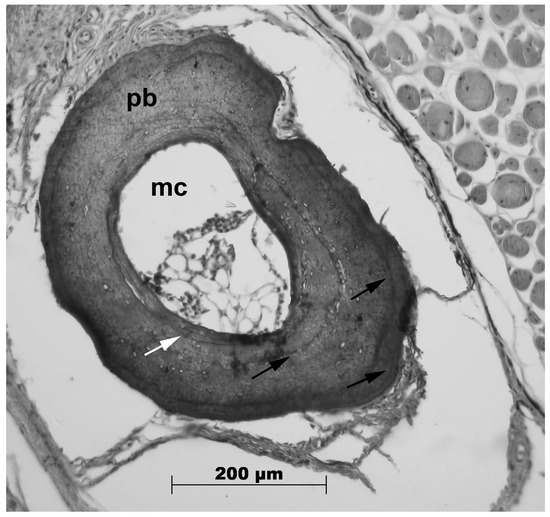 Example of phalangeal cross-section (10 μm thick) of Rhinella arenarum. Male, SVL: 96.5 mm; 3 LAGs. Black arrows = lines of arrested growth (LAGs); white arrows = Kastschenko line; mc = medullar cavity; pb = periosteal bone. (Photographed by Manuel Otero).