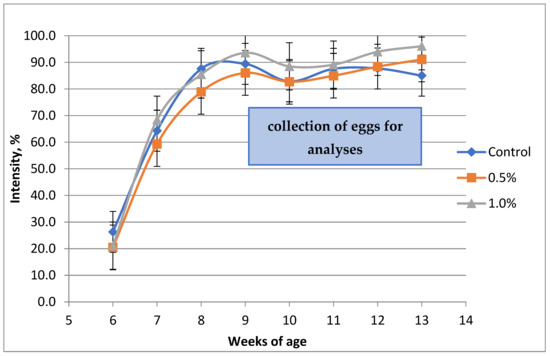 | Number of eggs produced per week | 57.2 b | 62.3 ab | 66.3 a | 6.76 | 0.0004 |