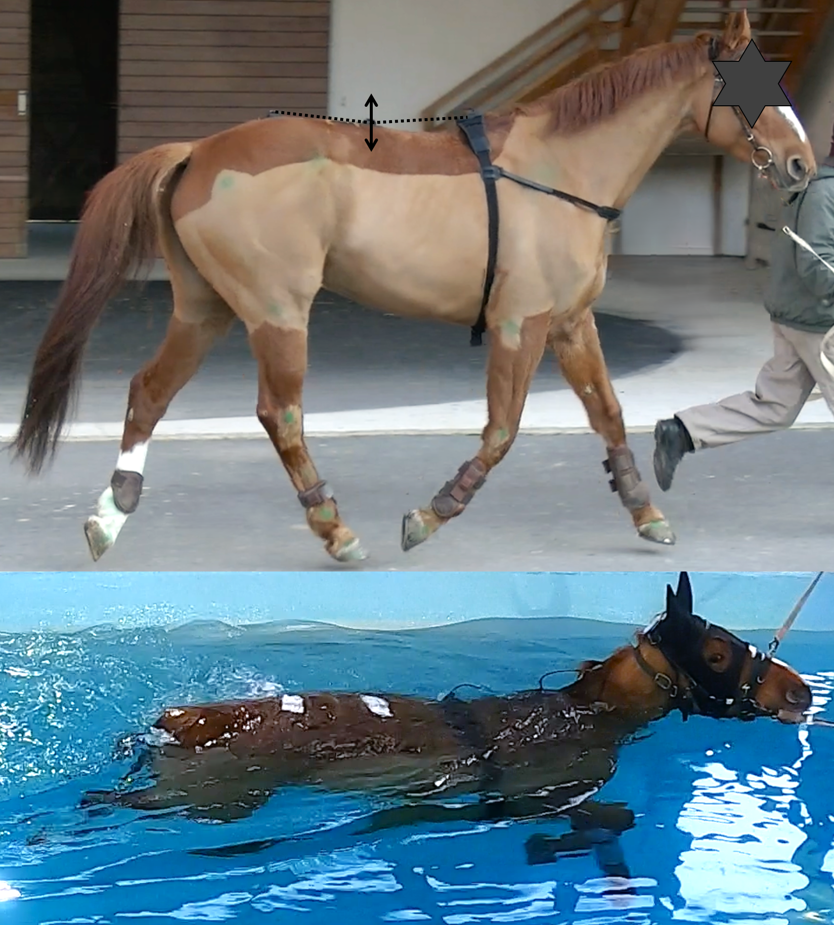 | Friday | Walker (40 min) + flatwork (5 min walk, 4 min slow canter, 30 min flatwork at 3 gaits) | Walker (40 min) + swimming (see Table 3) |