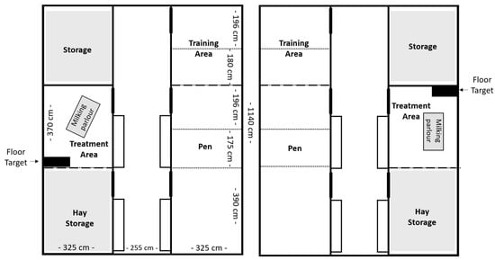 The treatment pens (one in each barn, see Figure 1) were located opposite the housing pens and measured approximately 12 m2 in size. This area contained a milking parlor with a portable milking machine (milk trolley for goats, Milkline, Italy), a table, and on blood-sampling days, a black rubber mat measuring 85 × 45 cm (floor target). Goats were individually let into the treatment pen for milking (1× daily at 1 p.m.), blood sampling (1–3× weekly), and positive reinforcement training (PRT). During milking, each goat received concentrated feed adjusted to milk yield.