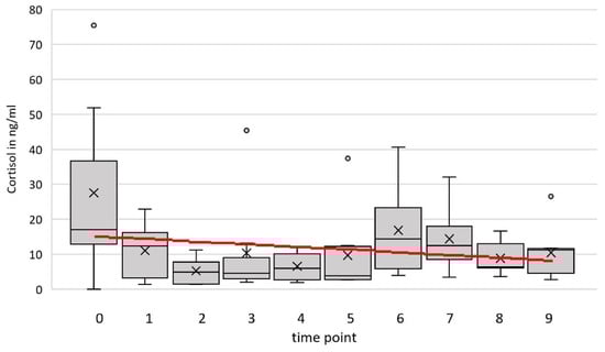 Cortisol level (ng/mL) of eight goats at nine time points and the additional zero sample (0). The red line represents the prediction by the simple linear model, with time point as the only independent variable.