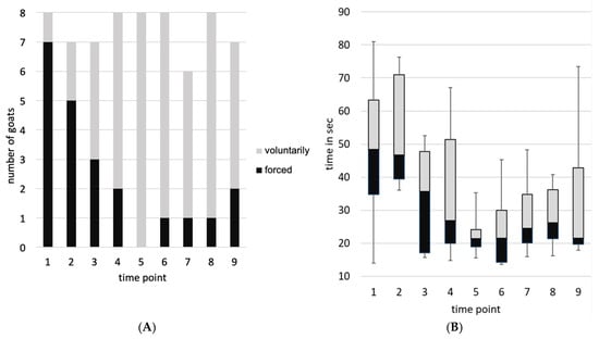 The blood sampling sessions took 3 to 10 min from separation from the group to the end of blood sampling. A maximum of three goats per time point attempted to escape from the position. No goat exhibited this behavior more than three times during the experiment. Per time point, two to a maximum of five animals showed at least one of the defensive reactions. Goat 2 showed no defensive reactions at any time, whereas goat 8 showed defensive behavior at all times. For example, kicking behavior was observed 35 times, 25 of which were by goat 8. The number of goats voluntarily walking on the floor target varied from one (time point 1) to all (n = 8, time point 5). On average, they required 17.4 s (time point 6) to 51.3 s (time point 2) to enter the position (see Figure 5).