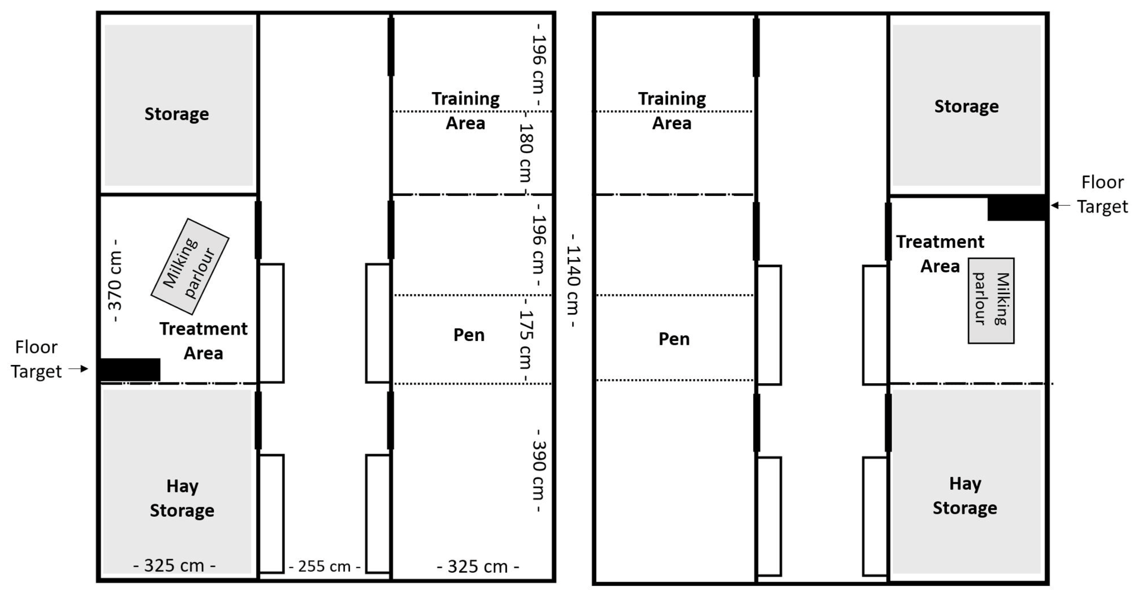 Pen design for Group E (left) and Group C (right). Dotted lines indicate fences, used only during weeks of individual housing.