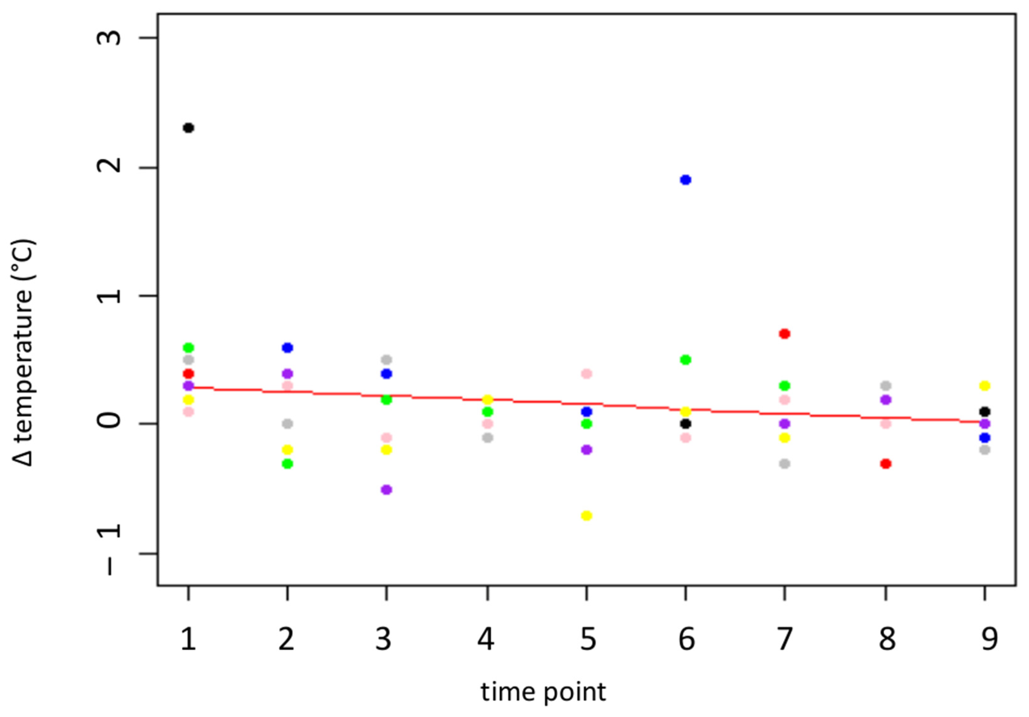 Temperature difference (°C) at the medial canthus before and after the insertion of the needle. The red line represents the prediction by the model, the colored dots represent the individual goats.