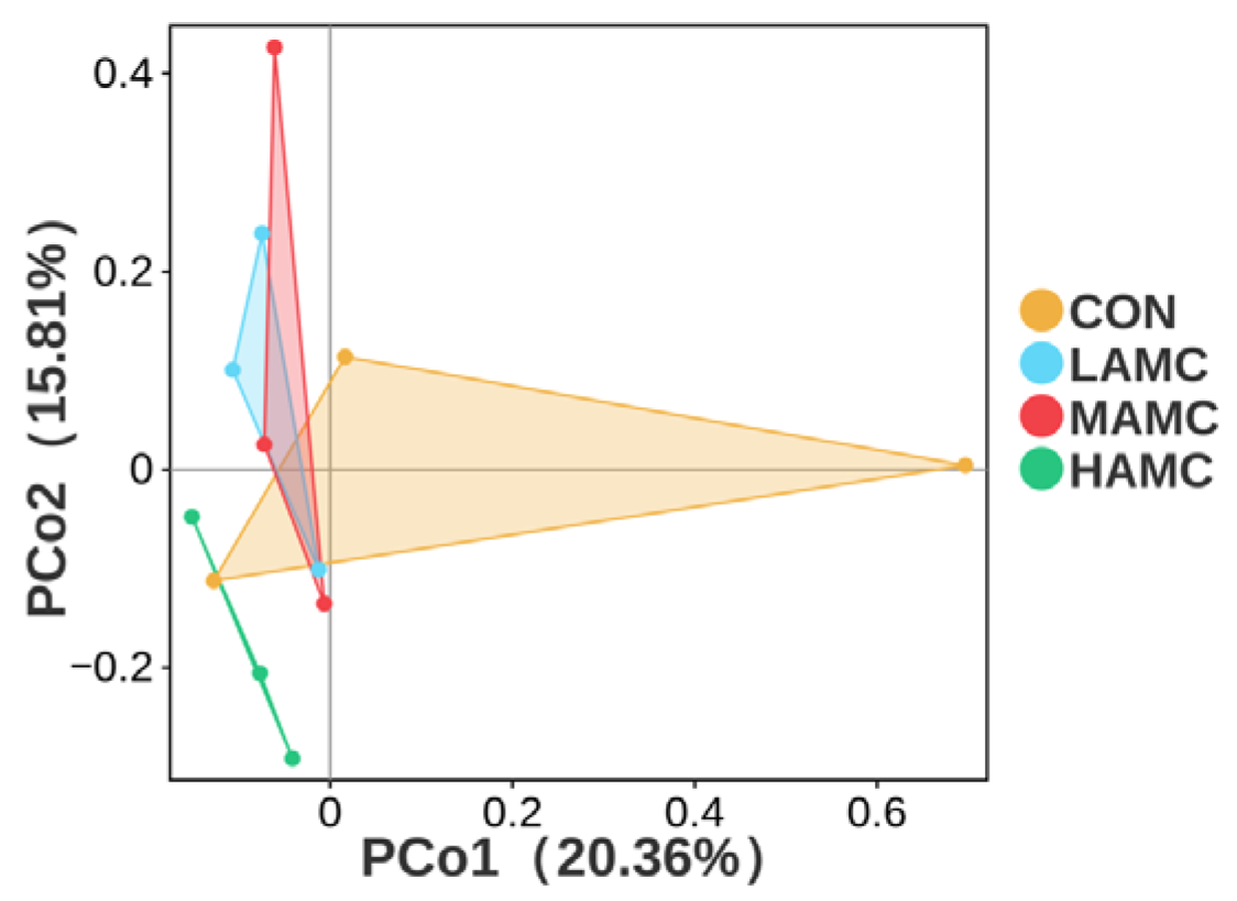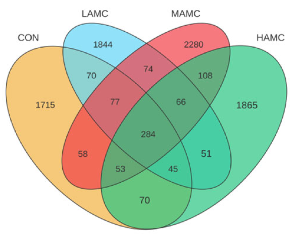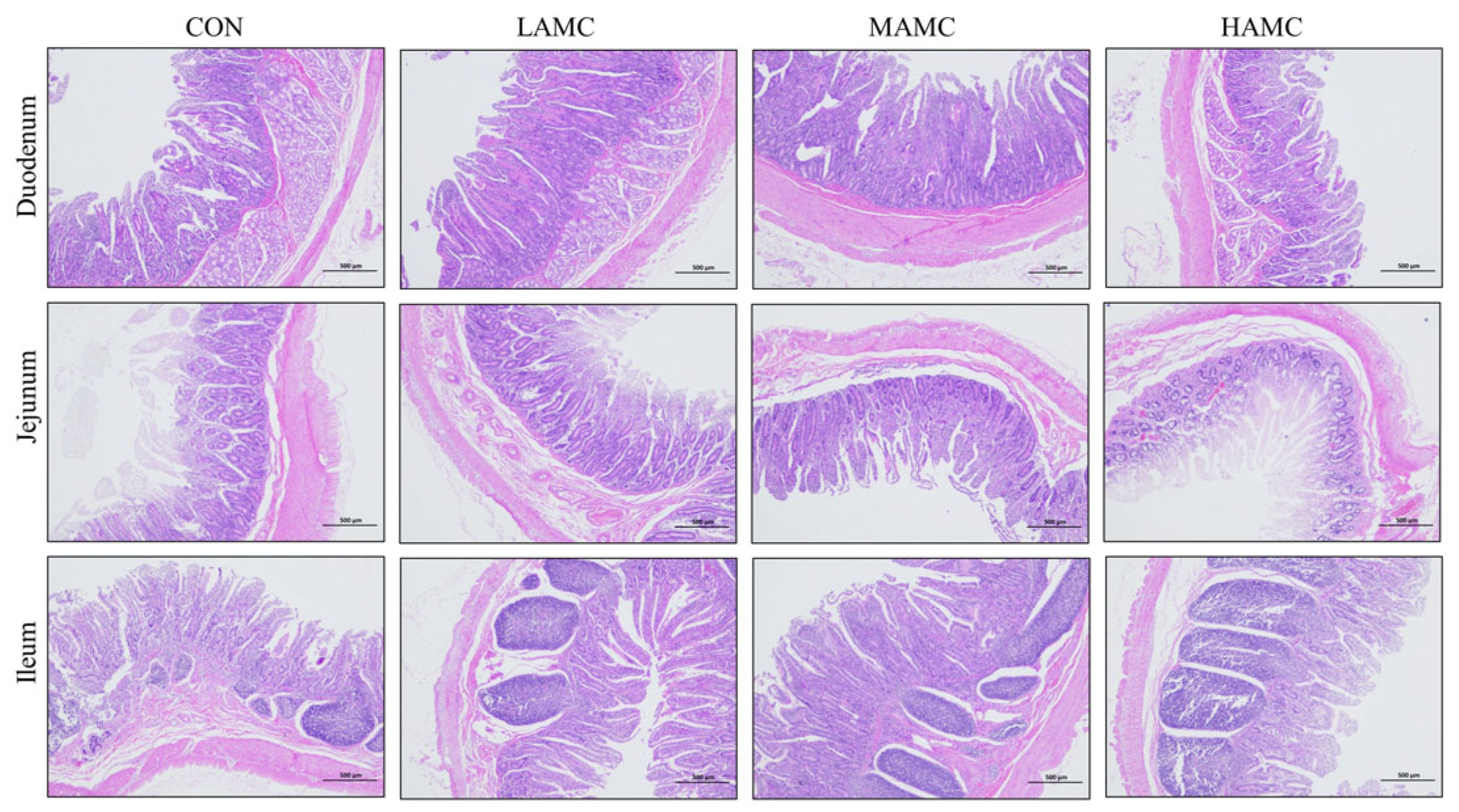 39]. However, in the present study, AMC supplementation did not significantly alter the intestinal morphology of the lambs. Nevertheless, AMC produced certain regulatory effects on the digestive enzyme content. Compared with the CON group, the amylase content in the duodenum was significantly increased in the MAMC group, which suggested that AMC may enhance carbohydrate hydrolysis by promoting amylase secretion, providing more available energy to the host. It is noteworthy that the lipase activity in both the duodenum and jejunum was significantly lower in the HAMC group than in the CON group, indicating a suppressive effect of the high-dose AMC on lipolytic function. Notably, the effects of AMC on intestinal digestive enzymes have rarely been reported, and the underlying regulatory mechanisms remain unclear. Further investigations are therefore warranted to elucidate how AMC modulates enzyme activities and the potential physiological implications. The integrity of the intestinal structure is primarily influenced by developmental stages, whereas digestive enzyme activities are subject to continuous fluctuations throughout the growth cycle, particularly during dietary transition phases [