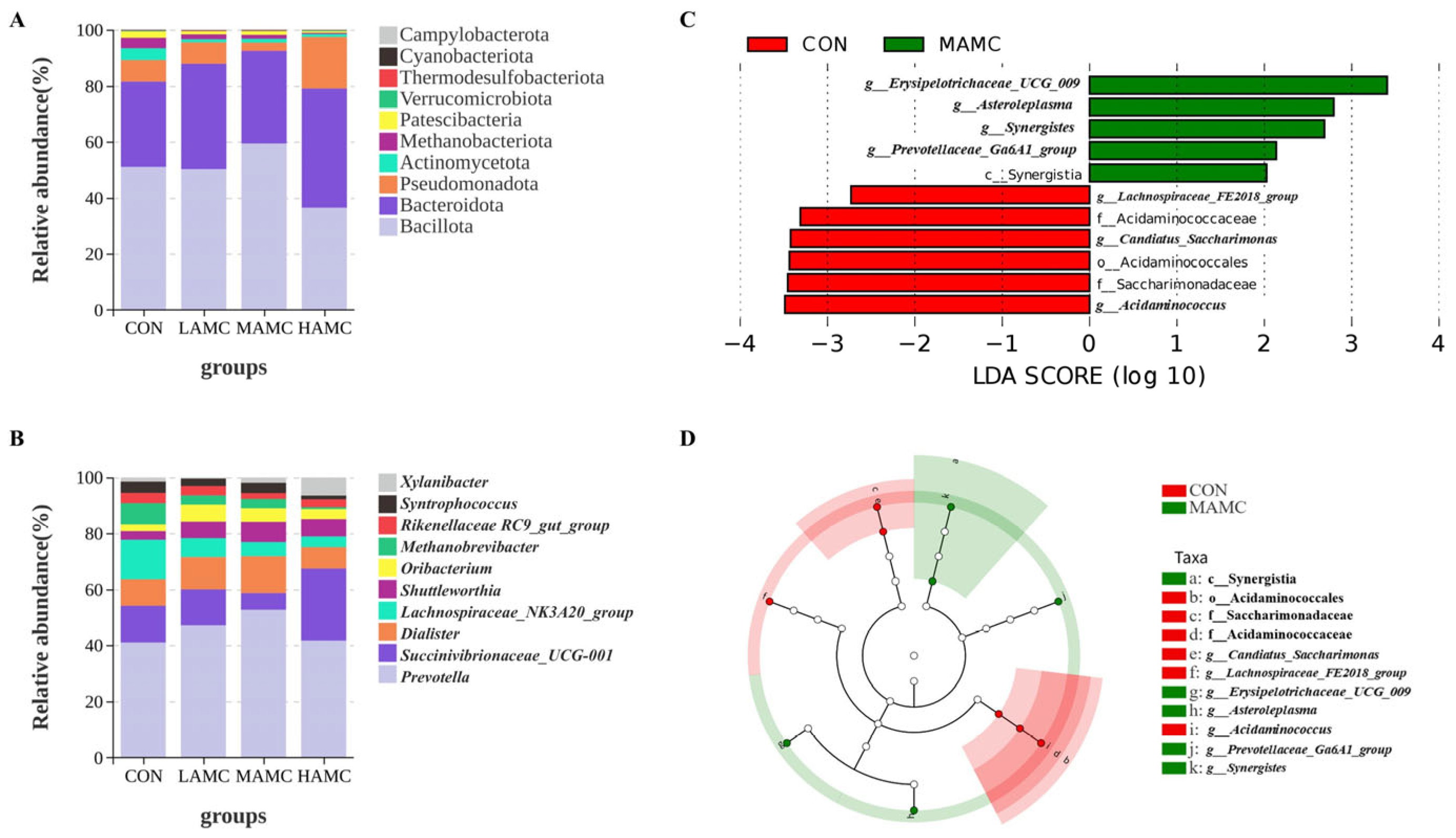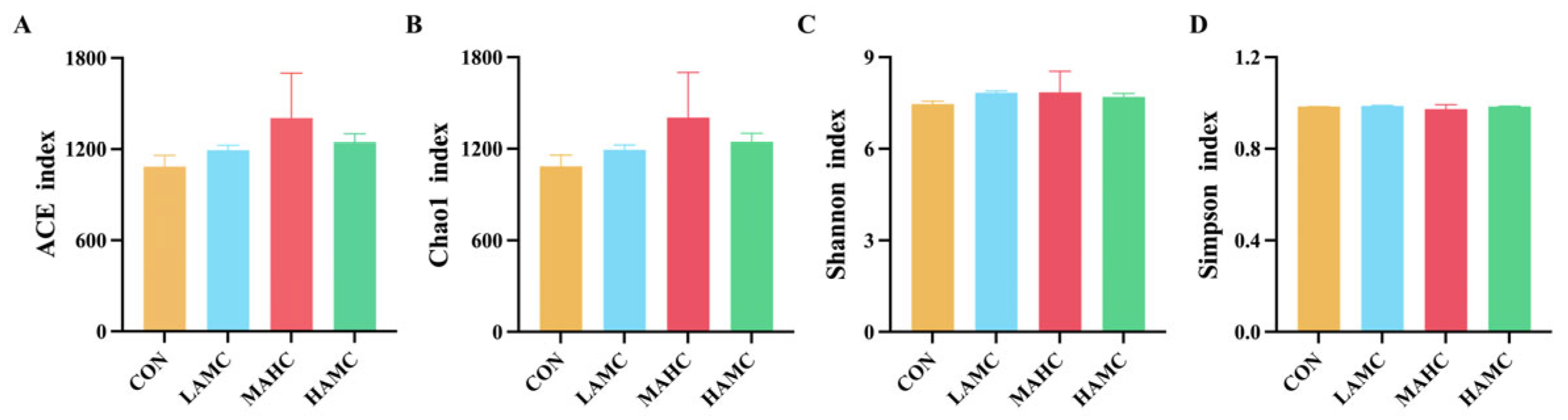 In our study, the AMC supplementation had no significant impact on ruminal fermentation parameters, indicating that AMC remains relatively stable in the rumen environment. However, changes in the ruminal microbial composition were observed. The MAMC group exhibited the highest number of OTUs, and the MAMC group displayed significantly increased
