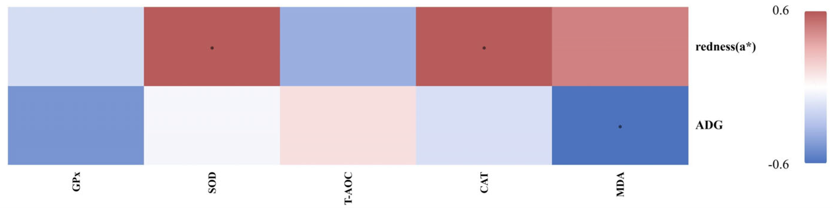 27]. The enhancement in meat color stability observed in the present study may be linked to an improved systemic antioxidant status. We observed that the AMC supplementation in the MAMC groups significantly elevated the serum SOD level, a key enzyme for mitigating oxidative stress. Furthermore, our correlation analysis indicated a significant positive correlation between the serum SOD level and meat redness (a*), suggesting a direct role of the antioxidant status in preserving the meat color.
