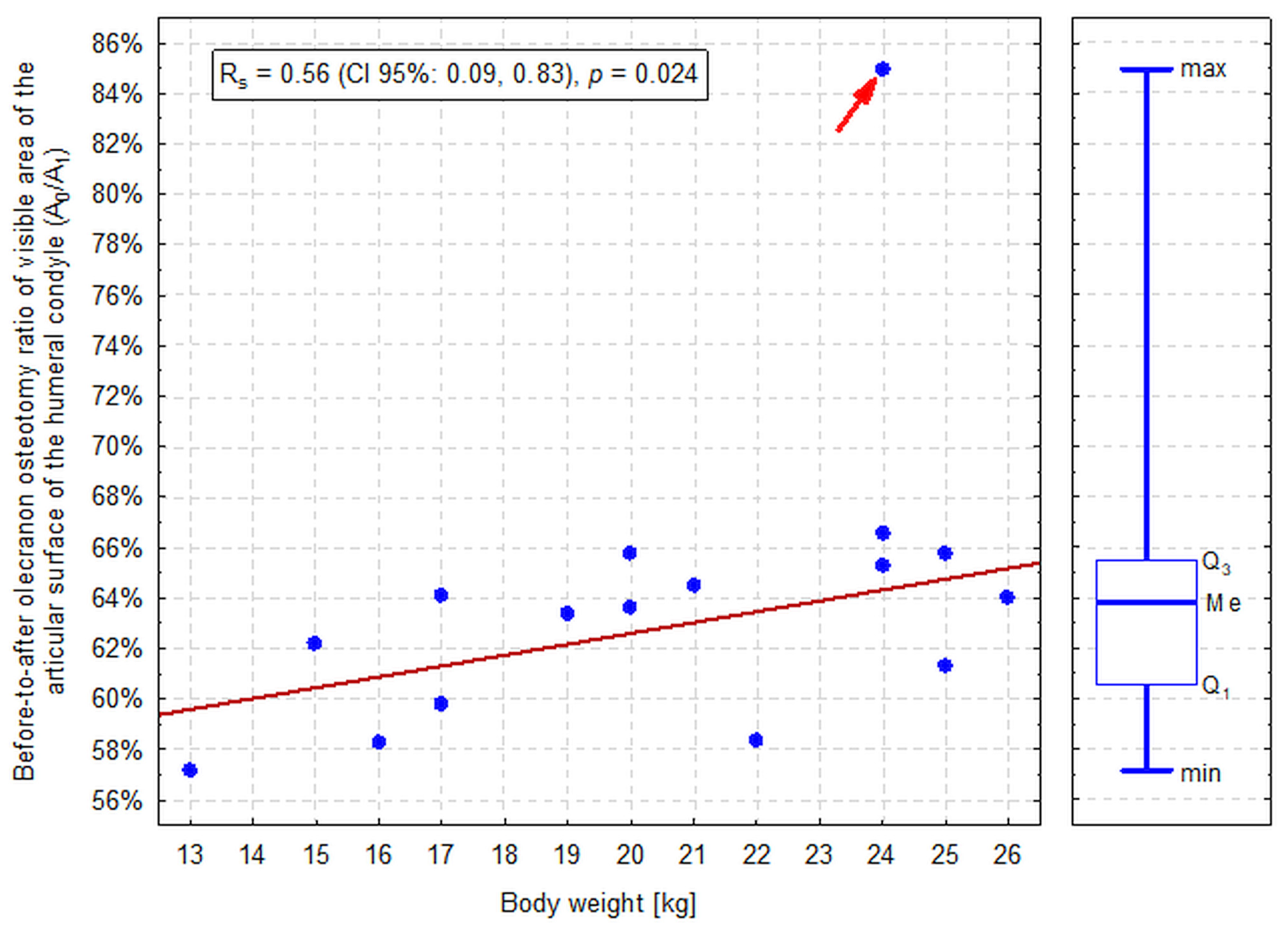 | After olecranon osteotomy (A1) [×103 px2] | 59.2, 41.9–61.5 (29.6–66.2) | 59.1, 41.4–61.1 (29.0–66.0) | 0.14 (−0.50, 0.67) | 0.605 |