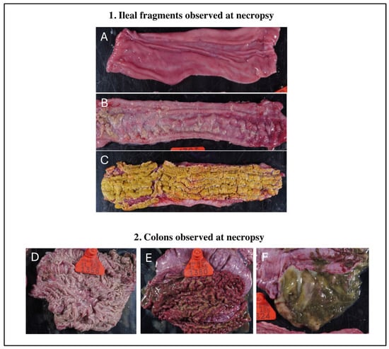 Board showing macroscopic lesions. Macroscopic photos were taken on D43, which is 21 dpi for LI and 13 dpi for Bhyo. 1. Gross lesions on ileal fragments: (A) normal ileal mucosa (NC pig). (B) Ileal lesions—edema, hyperemia, and thickening of mucosa (P-CO pig). (C) Ileal lesions—severe thickening of mucosa and necrosis (P-CO pig). 2. Gross lesions on colons: (D) a normal colon mucosa (P-CO pig). (E) Colon lesions—hyperemia, severe thickening of the mucosa, attached intestinal content, and diphtheritic membrane (P-CO pig). (F) Colon lesions—thickening of the mucosa and excessive mucus content (V-CO pig).