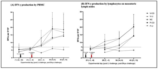 LI-specific IFN-γ production. (A) IFN-γ production by PBMCs, showing the systemic cell-mediated immune response. (B) IFN-γ production by lymphocytes on mesenteric lymph nodes, showing the gut-associated cell-mediated immune response. The results are expressed in spots-forming cells (SFCs) per 5 × 105 cells (total number of cells in each well of the ELISPOT 96-well plate). Each spot represents the average number of spots associated with each individual pig in each group in each time point. The bars represent the standard deviation.